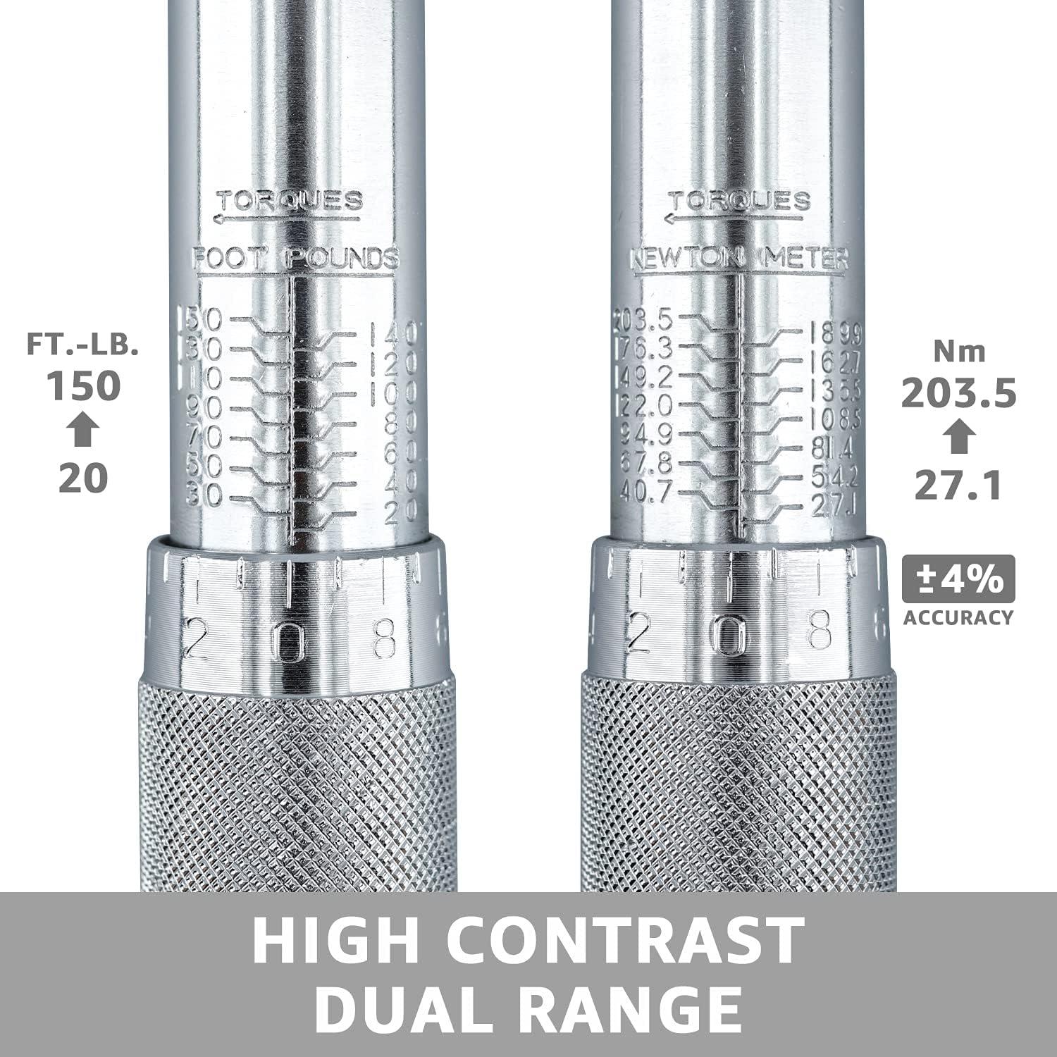 EASY TO READ SCALE: This adjustable torque wrench features a high contrast, dual range scale pre-calibrated to an accuracy of ± 4% for reliable and precise adjustments