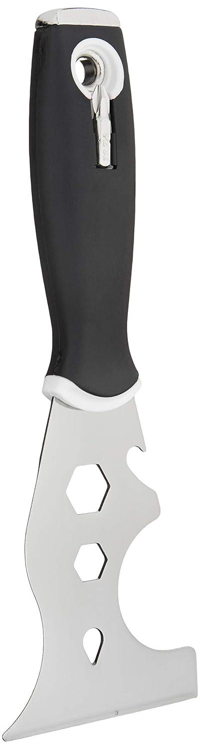 Versatile: includes a crack opener, nail puller, convex and concave scrapers, 1/4- and 3/8-inch nut wrenches, #8-10 slotted screwdriver bit, #2 Phillips screwdriver bit, bit holder, bottle opener, paint-can opener, and roller cleaner