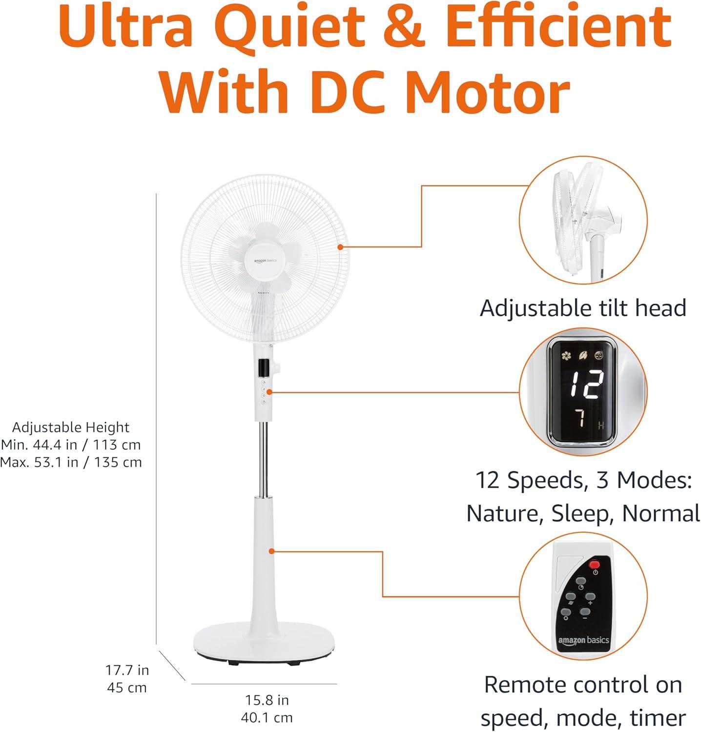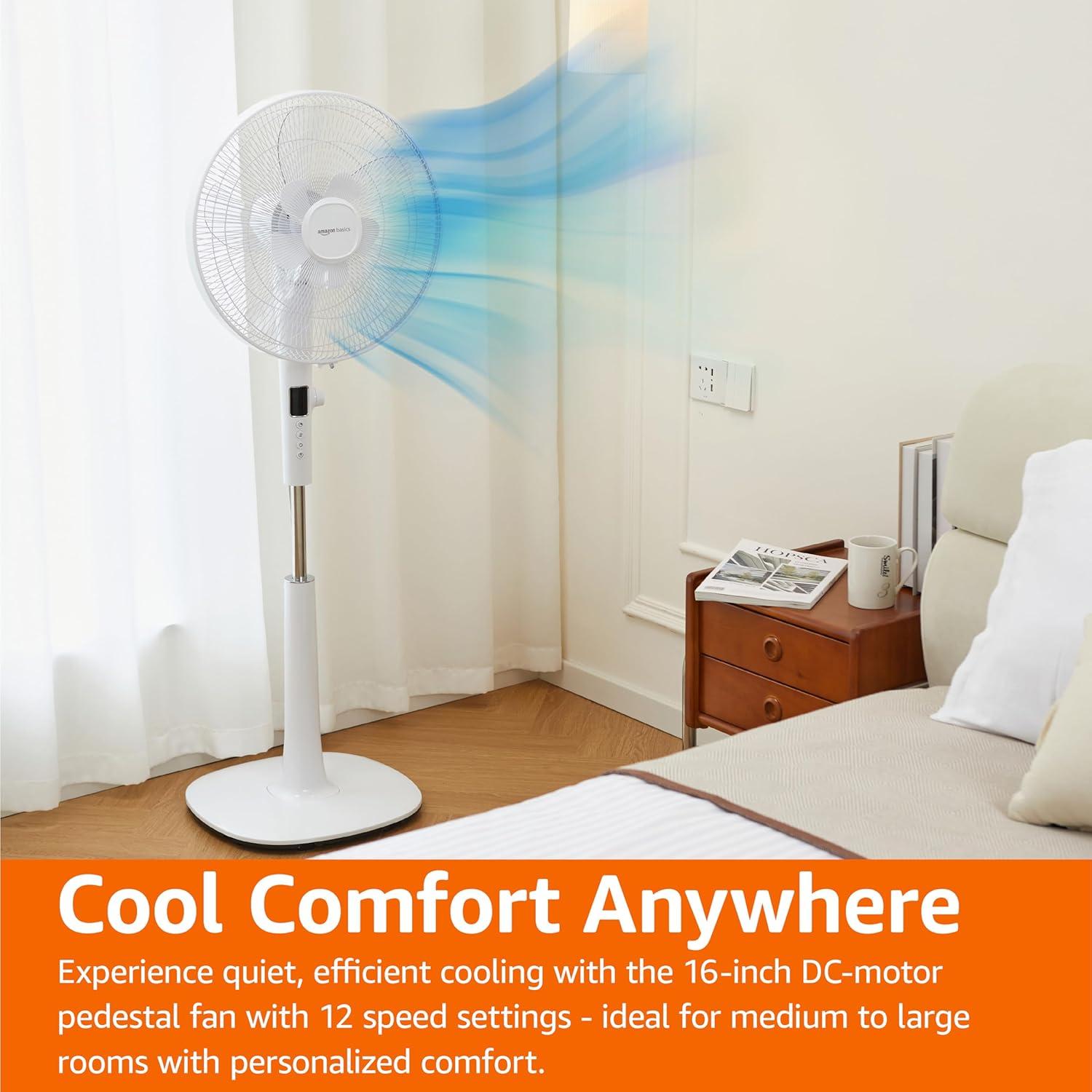 Amazon Basics 16" Pedestal Fan with Remote for Bedroom, Living Room, Office, Adjustable Height, Dual-Layered Blades, 3 Speeds, 3 Modes, Timer, Tilt Head, 60W, Black(12-Speed DC Motor)