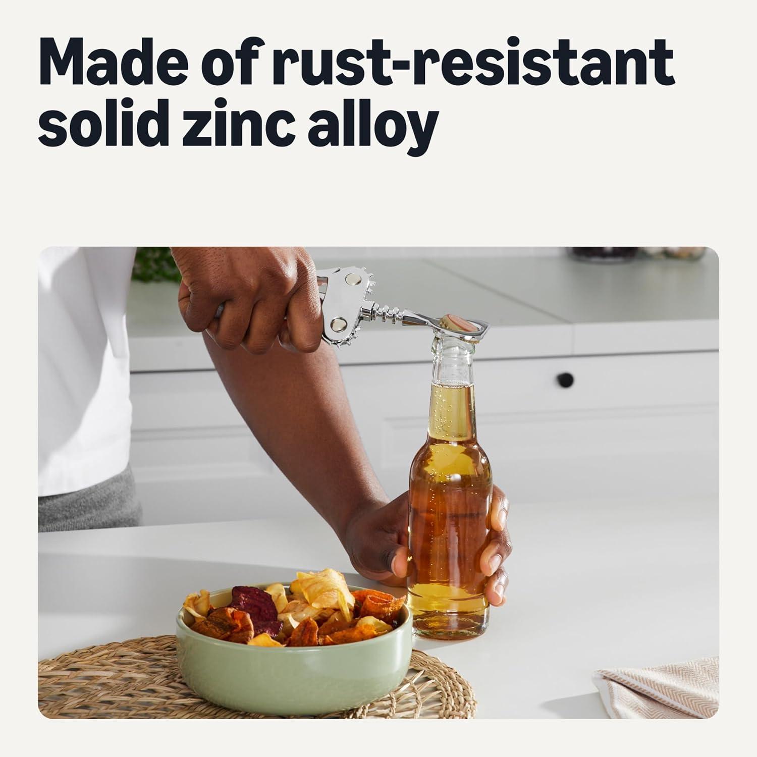 EASY BOTTLE CAP REMOVAL: Standard soda, seltzer, or beer bottle opener component pops off caps effortlessly