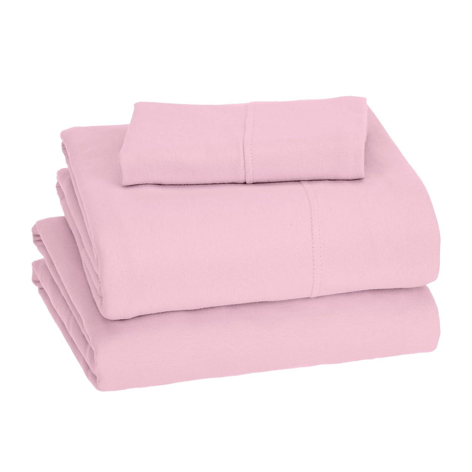 imageAmazon Basics 3 Piece Bed Sheet Set 100 Cotton Jersey Includes Super Soft Flat and Fitted Sheets Pillowcase Toddler Pink SolidSky Blue