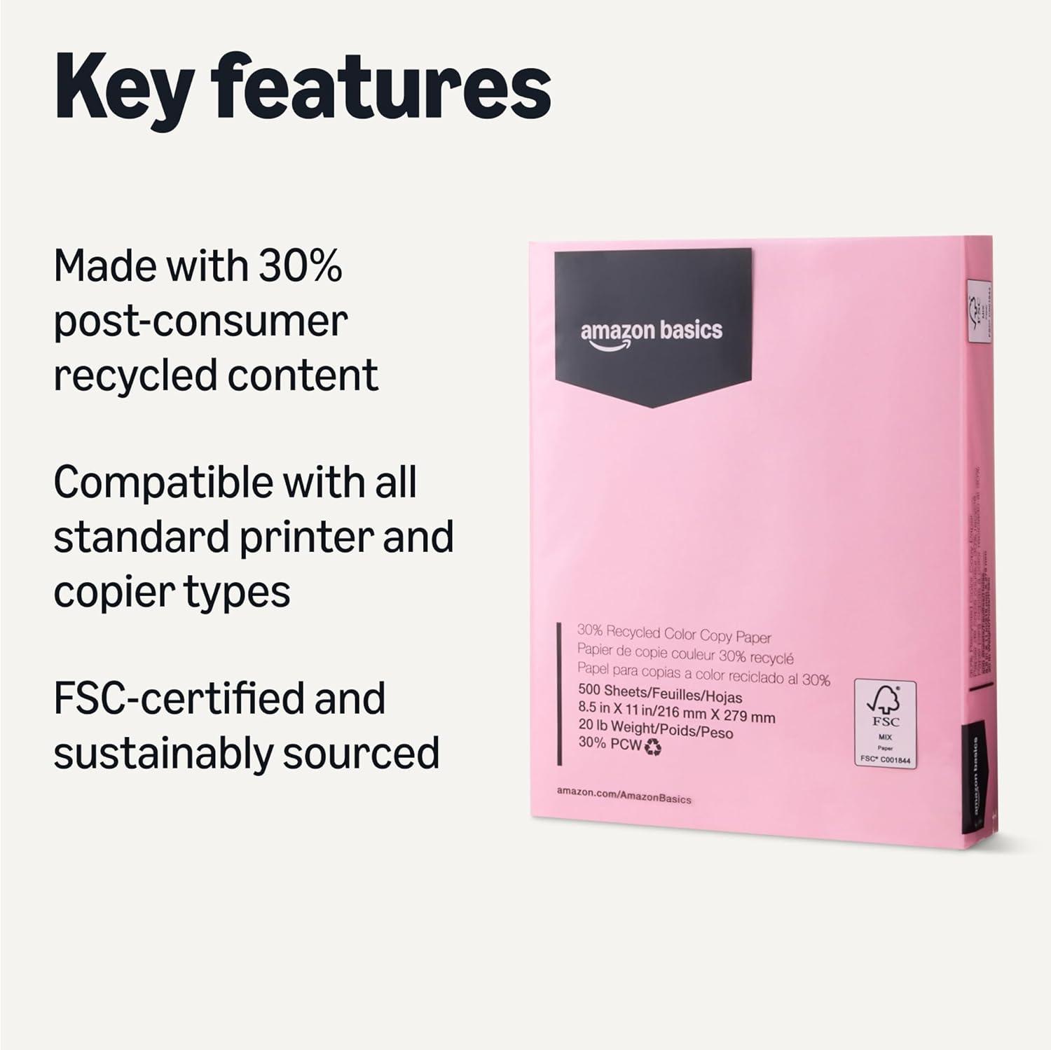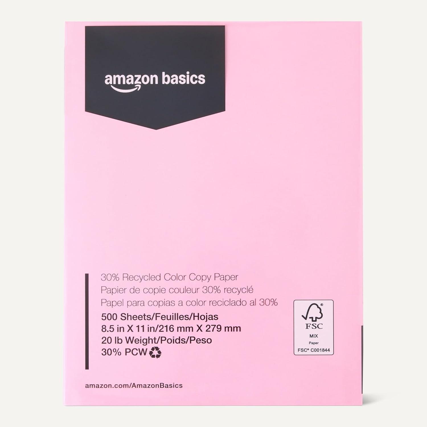 Amazon Basics 30% Recycled Color Copy Paper, 8.5" x 11", 20lb, 500 Sheets, Pastel Canary(Pastel Pink)