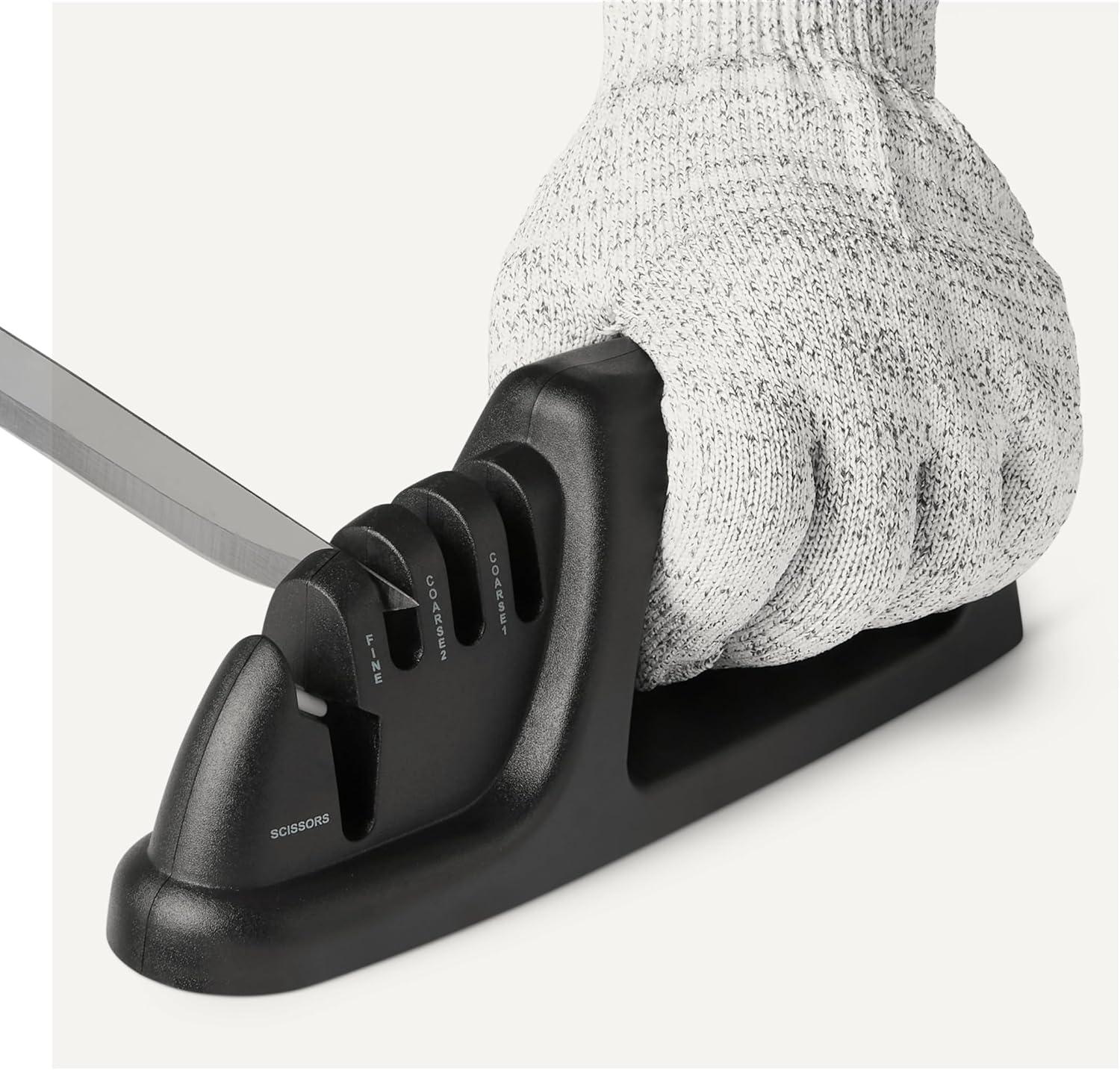 This versatile 4-in-1 knife sharpener features three sharpening stages for different blade types plus a dedicated scissor slot, all secured by a non-slip base for safety. Complete with protective gloves, this easy-to-clean tool is perfect for maintaining kitchen, pocket, and hunting knives to keep them performing at their best. Amazon Basics are the quality products you count on for all your everyday moments.