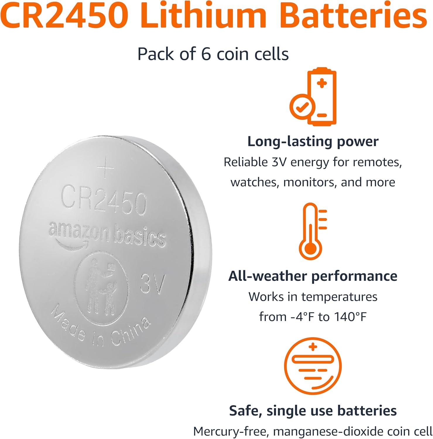 Amazon Basics 6-Pack CR2450 Lithium Coin Cell Battery, 3 Volt, Long Lasting Power, Mercury-Free, Child-Safe Package (Use Scissors to Open)(6)