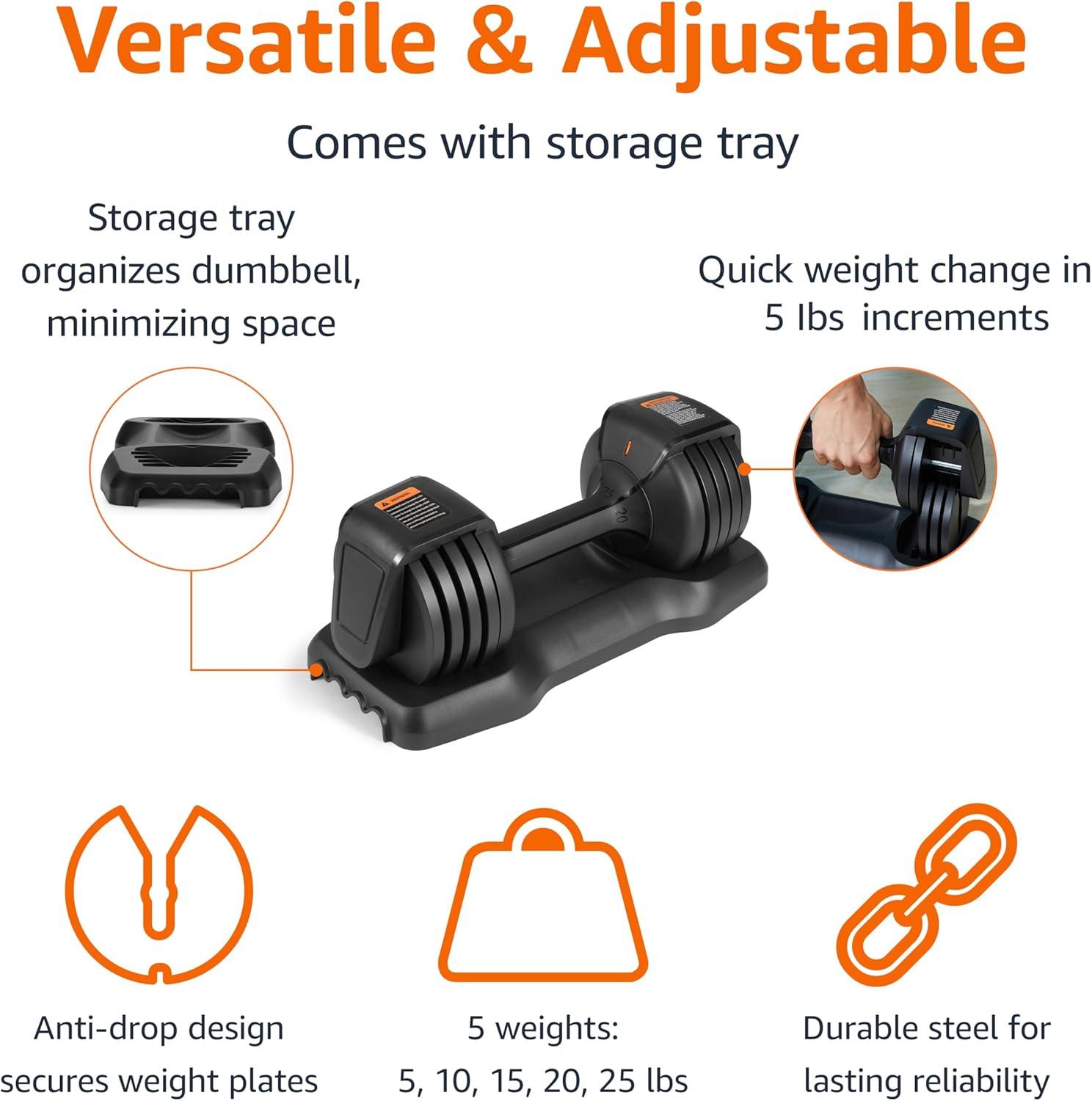 Single dumbbell with 5 adjustable weight options (5, 10, 15, 20, and 25 pounds), plus a storage tray