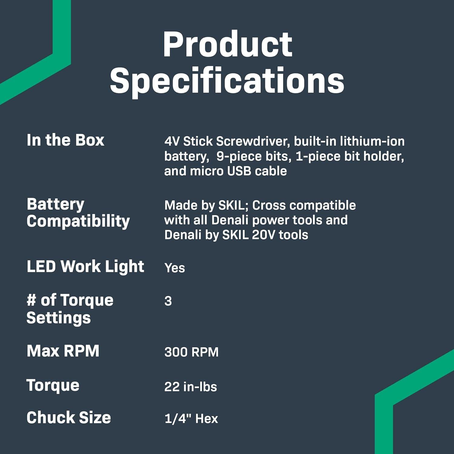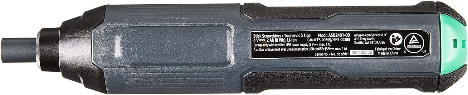 Includes a 4V electric stick screwdriver, built-in 2000mAh Lithium-ion battery, USB-C charging cable, and 9-piece bits and 1-piece bit holder