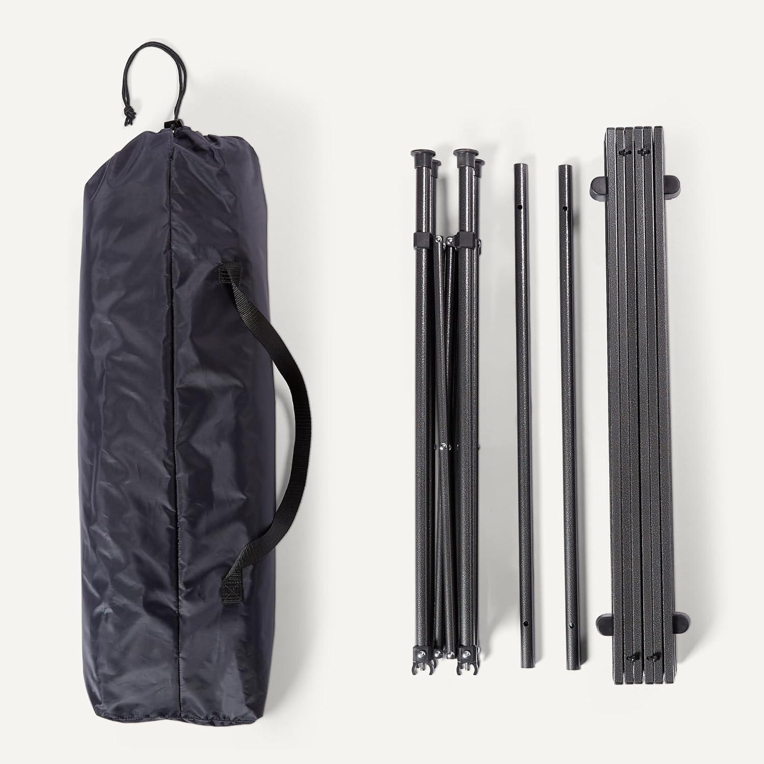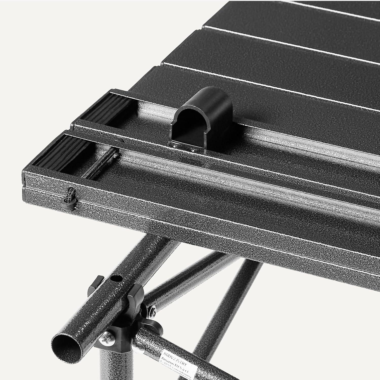 Sturdy slat top is aluminum and rolls up for compact storage. Heavy duty steel frame provides extra durability and stability.