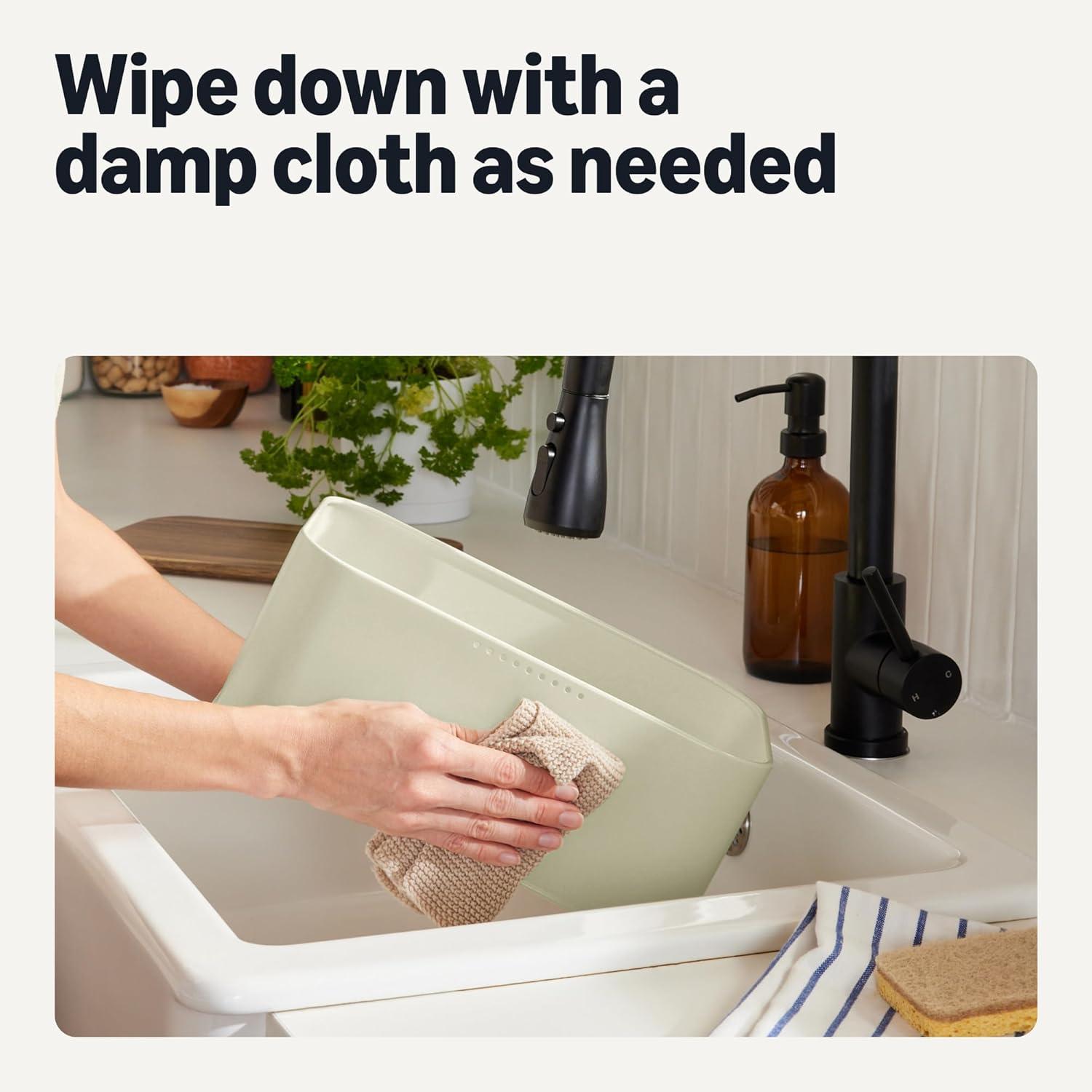 WIPE CLEAN To clean bread box and cutting board, simply wipe down with a damp cloth rinsed with clean water