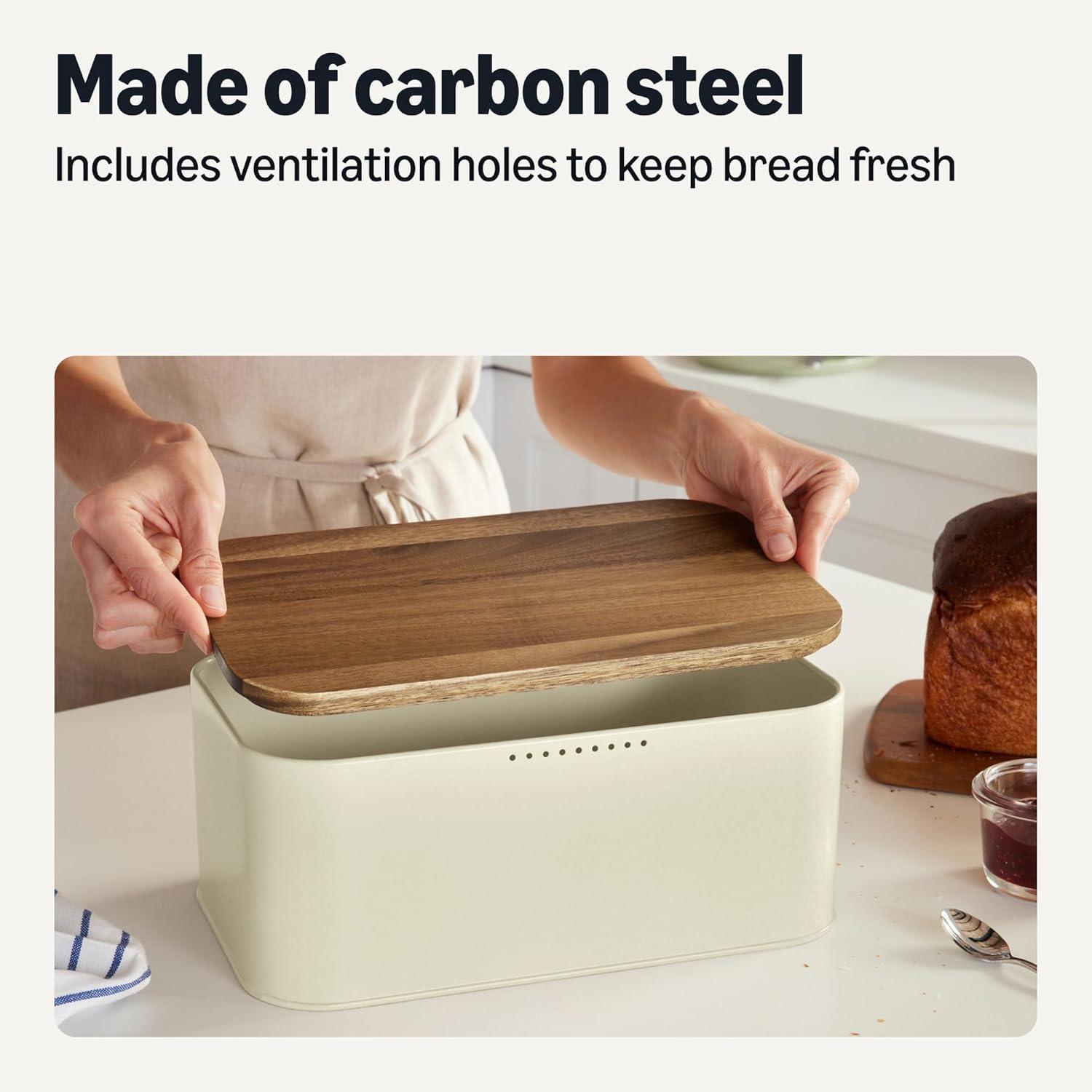 STORAGE AND CUTTING BOARD: Bread storage box with acacia wood lid that doubles as a cutting board for slicing fresh bread for sandwiches, toast, and more