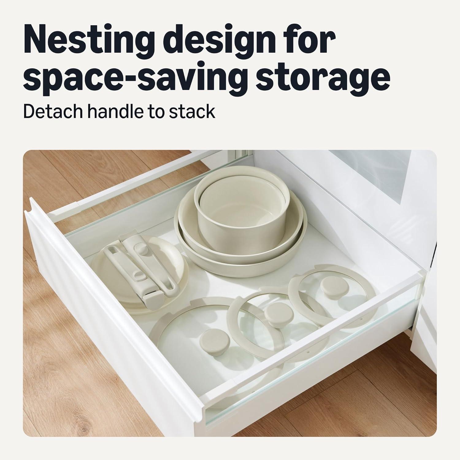 DETACHABLE HANDLES: Cool-touch, interchangeable handles let you seamlessly move from cooking and baking to storing; stackable pieces and lids help maximize space and keep your kitchen organized