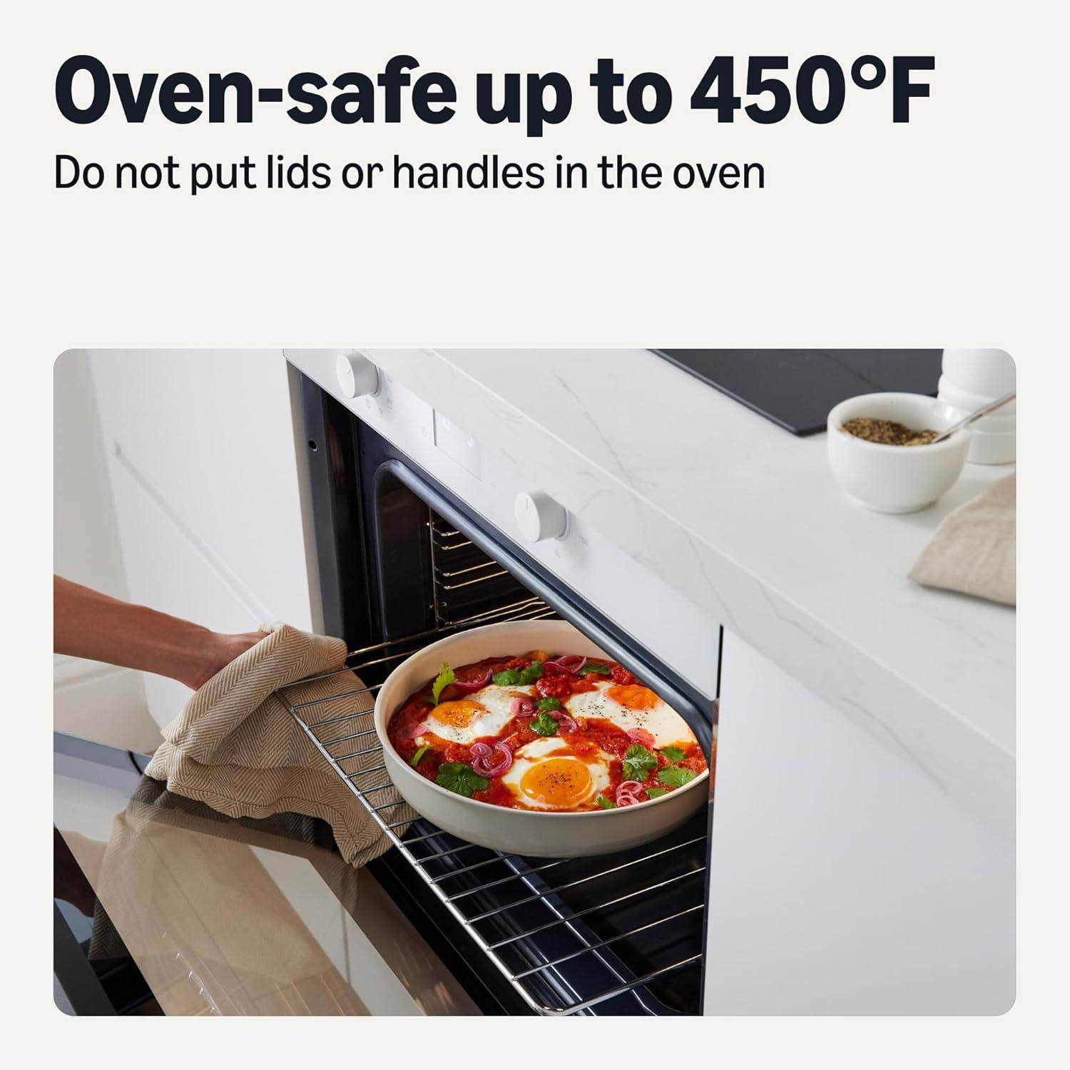 VERSATILE COMPATIBILITY: Suitable for all stovetops, including induction; pots and pans are oven-safe up to 450°F; do not put lids or handles in oven; dishwasher-safe excluding handles