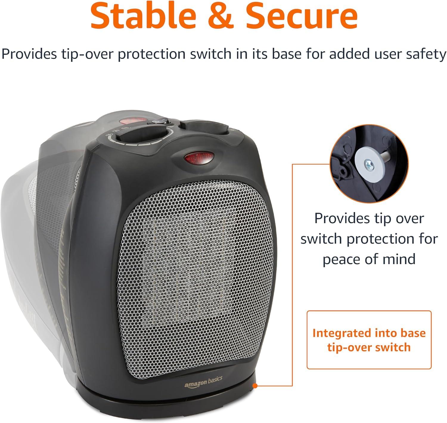 Amazon Basics Ceramic Space Heater, Portable Indoor Heating Solution, With Overheat and Tip-Over Protection, Thermostat, Non-Oscillating, 1500W, 7.52"D x 6.34"W x 9.45"H, Silver(black)