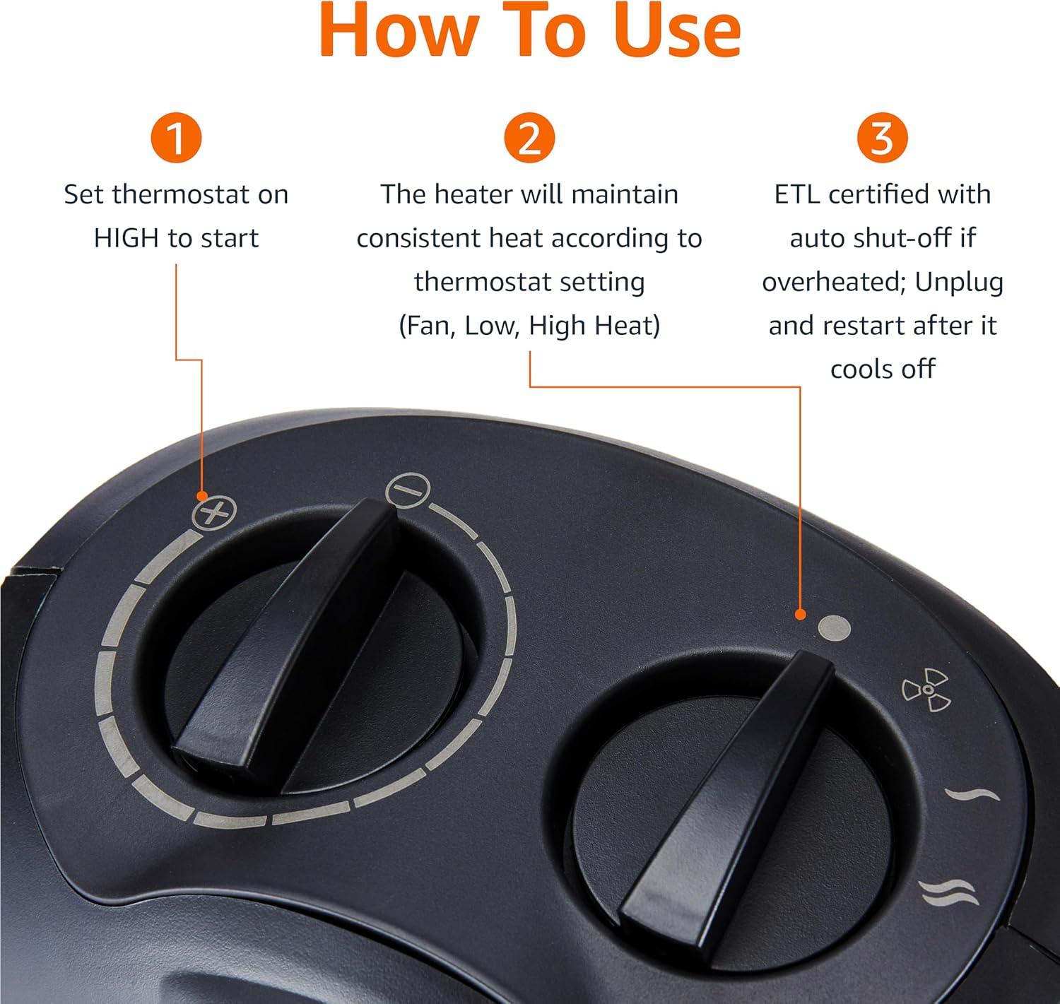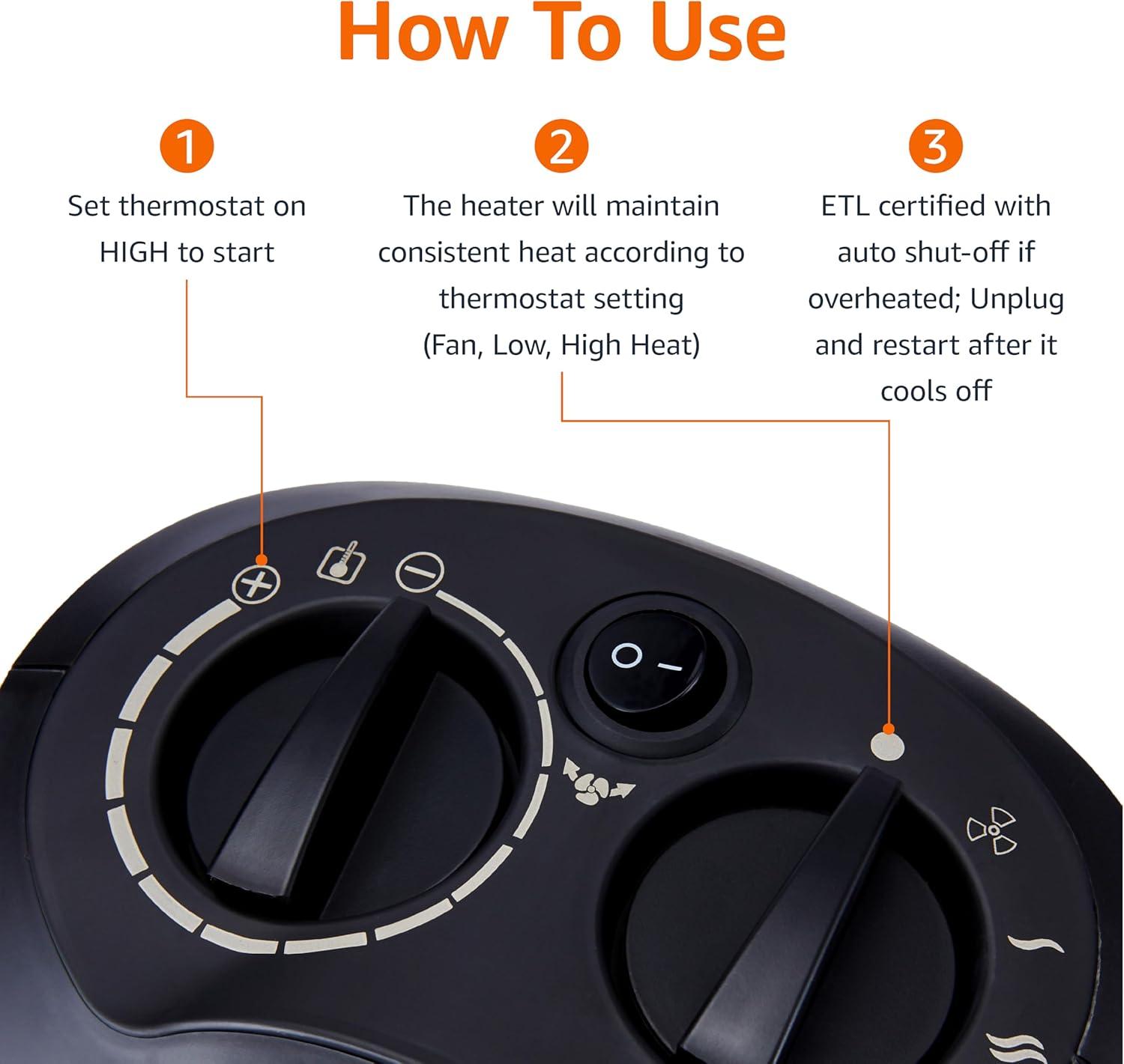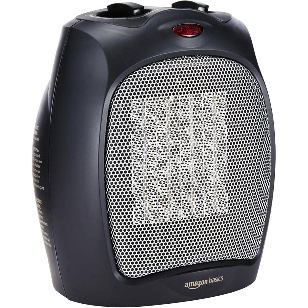 Amazon Basics Ceramic Space Heater, Portable Indoor Heating Solution, With Overheat and Tip-Over Protection, Thermostat, Non-Oscillating, 1500W, 7.52″D x 6.34″W x 9.45″H, Silver(black)