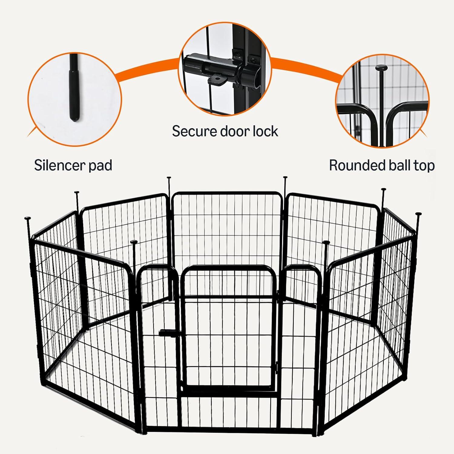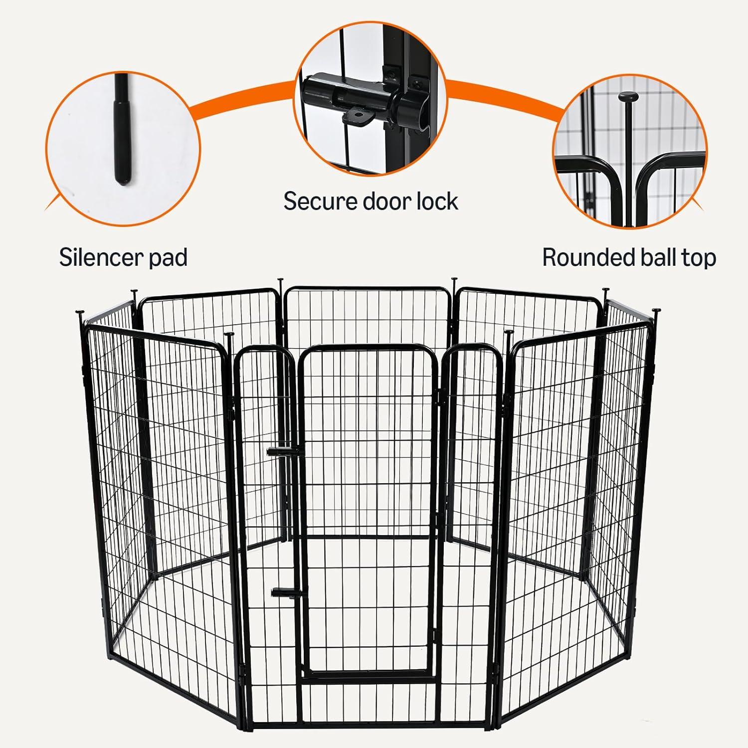 SECURE DESIGN: The metal dog playpen features rounded edges and secure bar spacing to help protect pets. The door latch locks automatically, and ground stakes keep panels stable on grass or soft soil