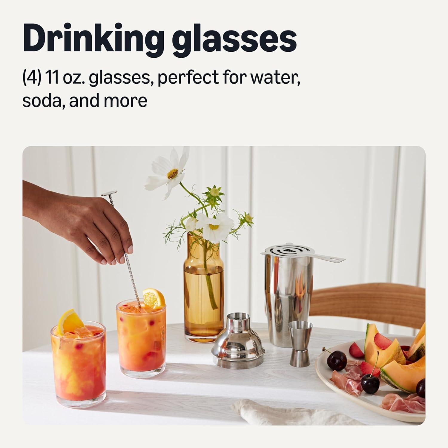 This versatile 4-piece set of 11 oz. glasses features thick, durable construction perfect for everyday beverages and comfortable handling. Made for lasting performance, these dishwasher-safe glasses combine practicality with classic style, making them ideal for any home or bar setting. Amazon Basics are the quality products you count on for all your everyday moments.