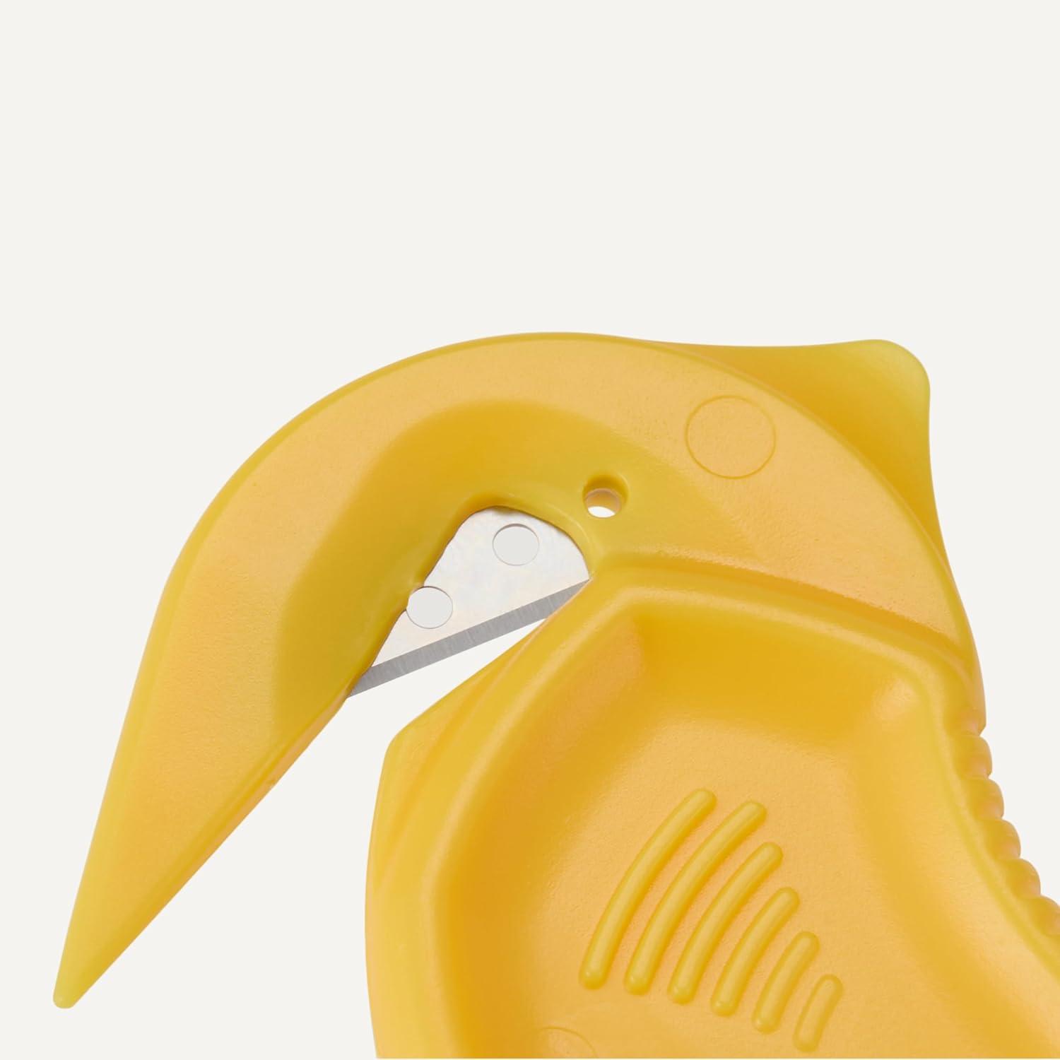 ENCLOSED BLADE DESIGN: Recessed stainless steel blade cuts through plastic film, shrink wrap, and strapping materials