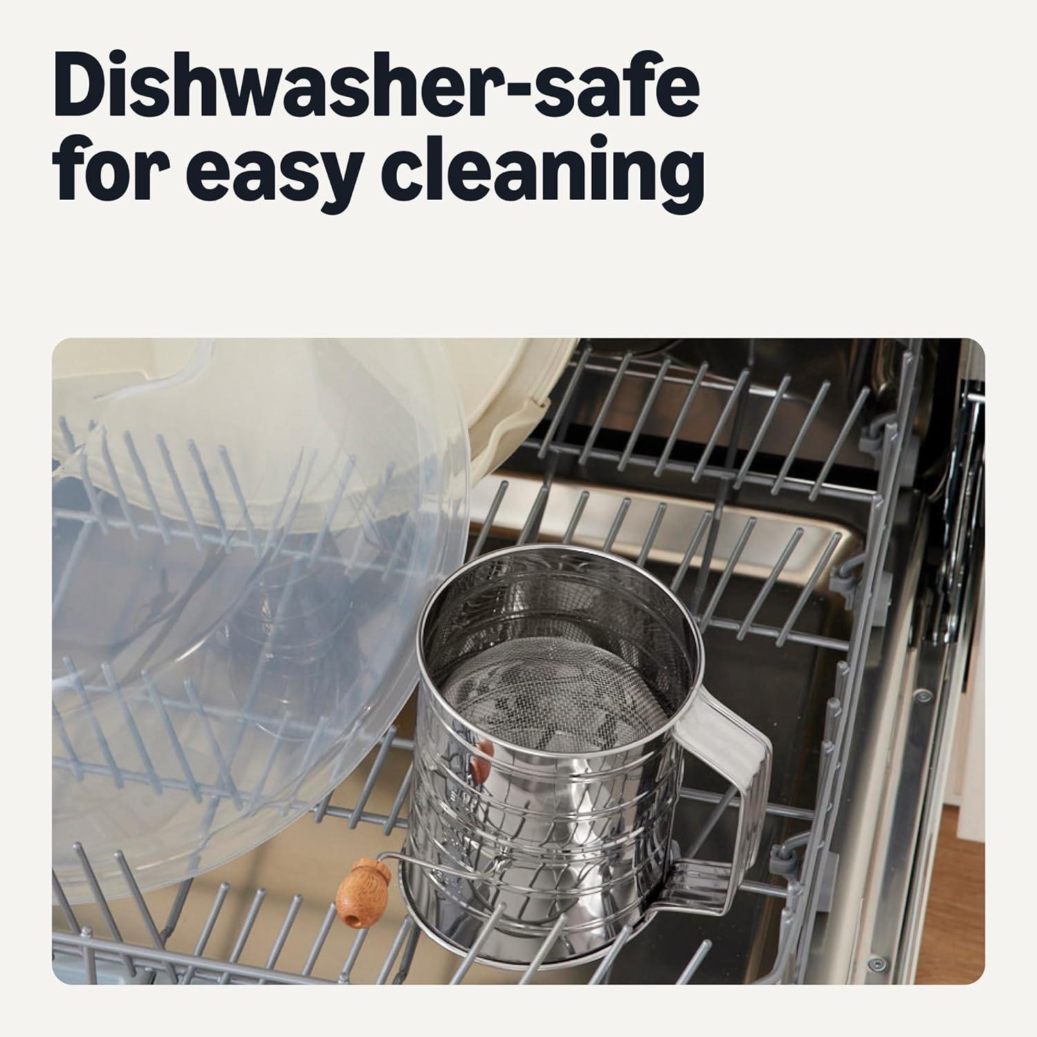 This versatile 3-cup flour sifter features durable stainless steel construction and a convenient hand crank design, perfect for achieving lump-free, finely milled flour and powdered sugar. The dishwasher-safe sifter includes measurement markers and a two-wire agitator system for superior aeration, ensuring professional baking results every time. Amazon Basics are the quality products you count on for all your everyday moments.