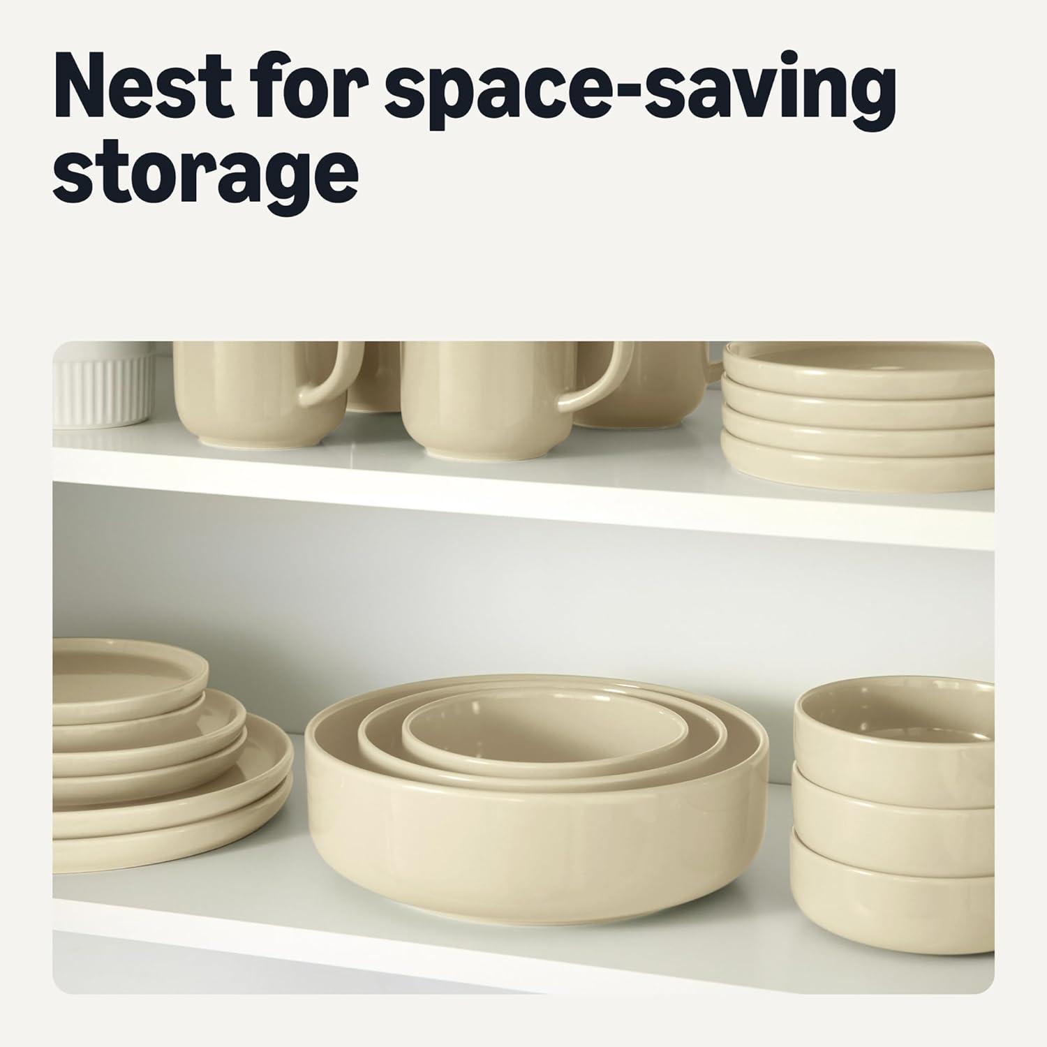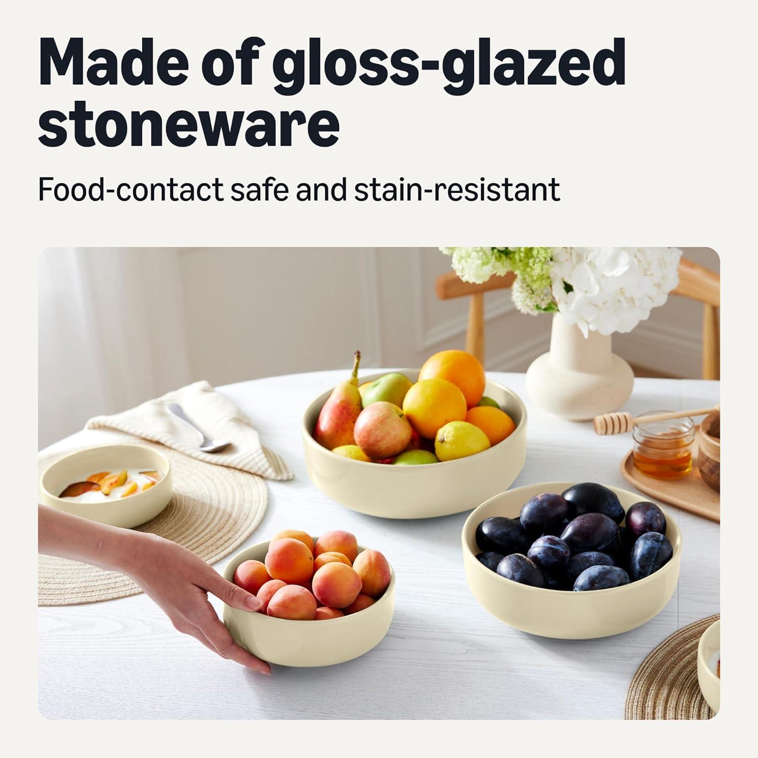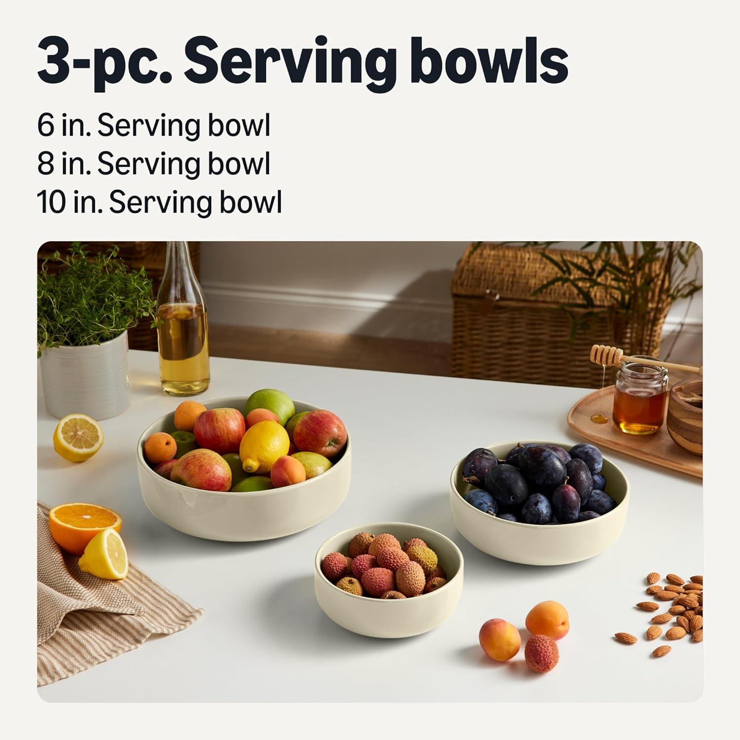 Elevate your dining experience with this versatile 3-piece stoneware serving bowl set, featuring elegant glazing and convenient sizes from 6 to 10 inches. Microwave-safe, dishwasher-safe, and stain-resistant, these nestable bowls combine modern style with practical functionality. Amazon Basics are the quality products you count on for all your everyday moments.
