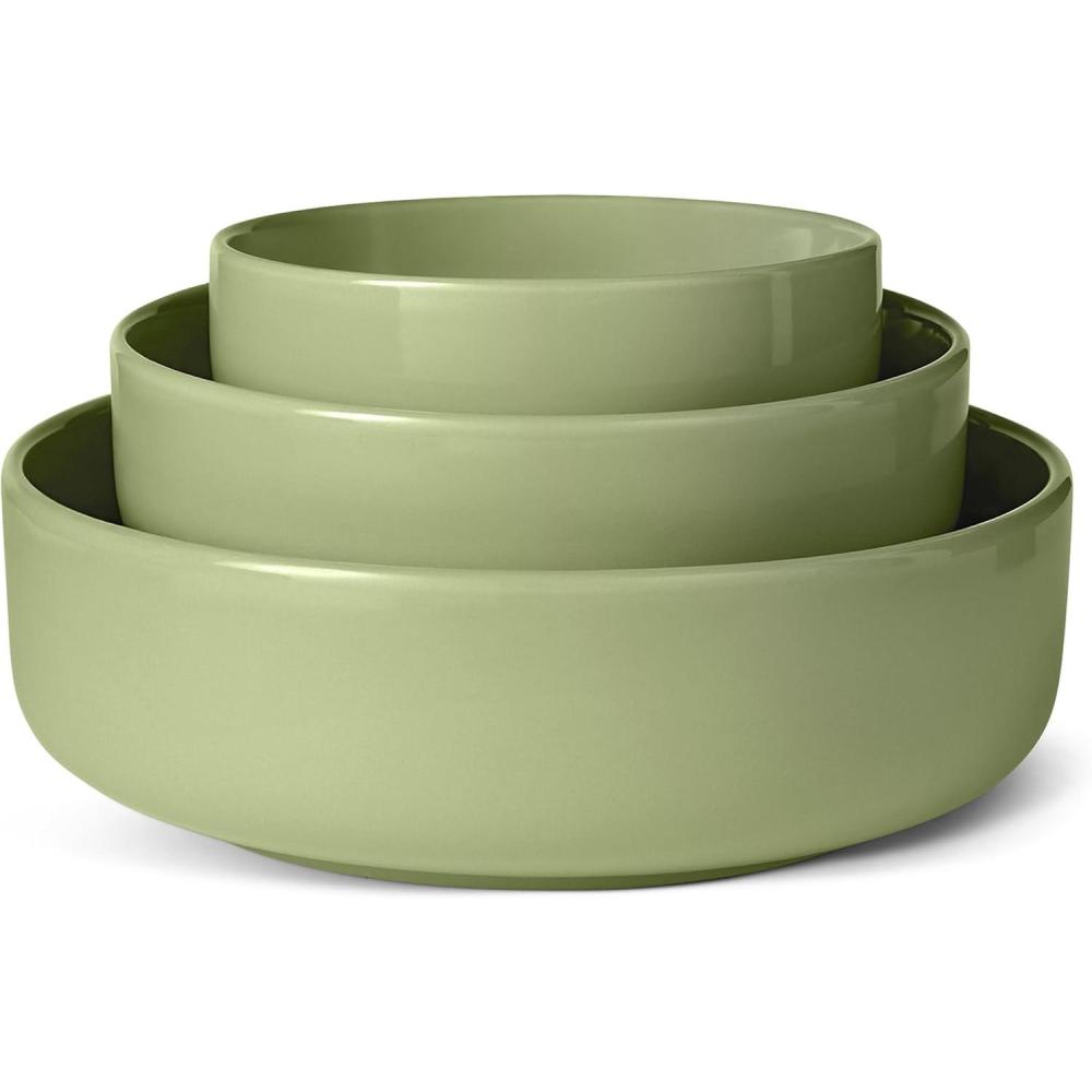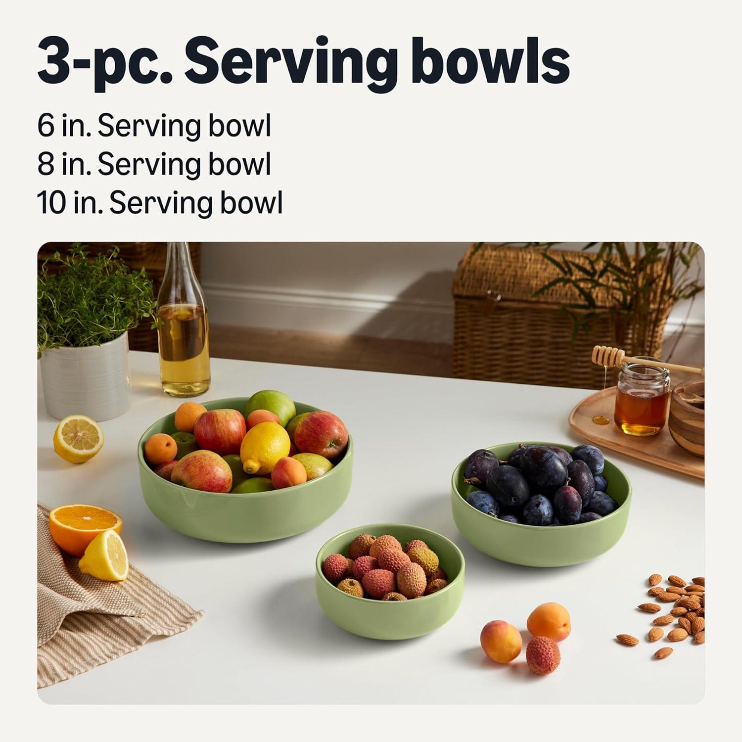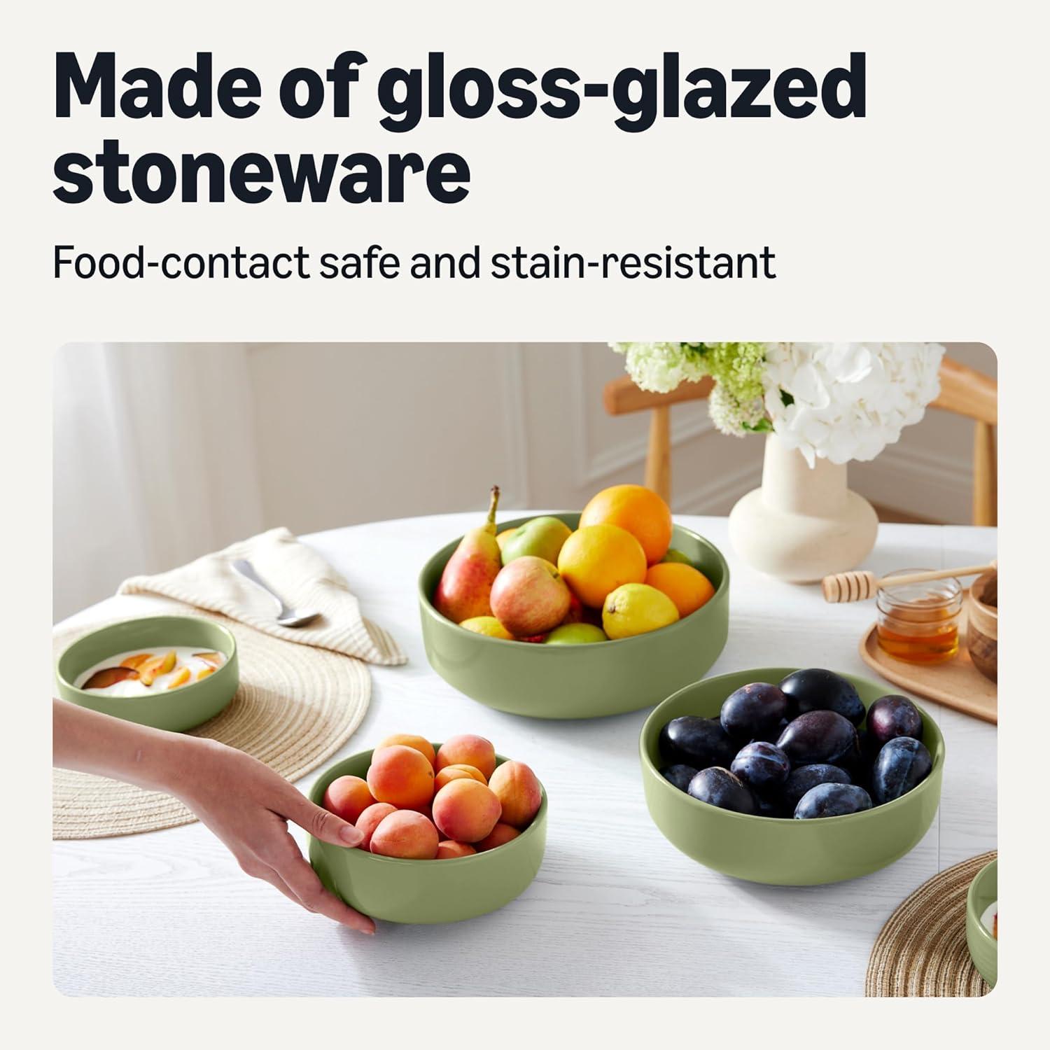 Amazon Basics Glazed Stoneware Serving Bowls, 3-Piece Set, Dishwasher-Safe, Olive(Olive)