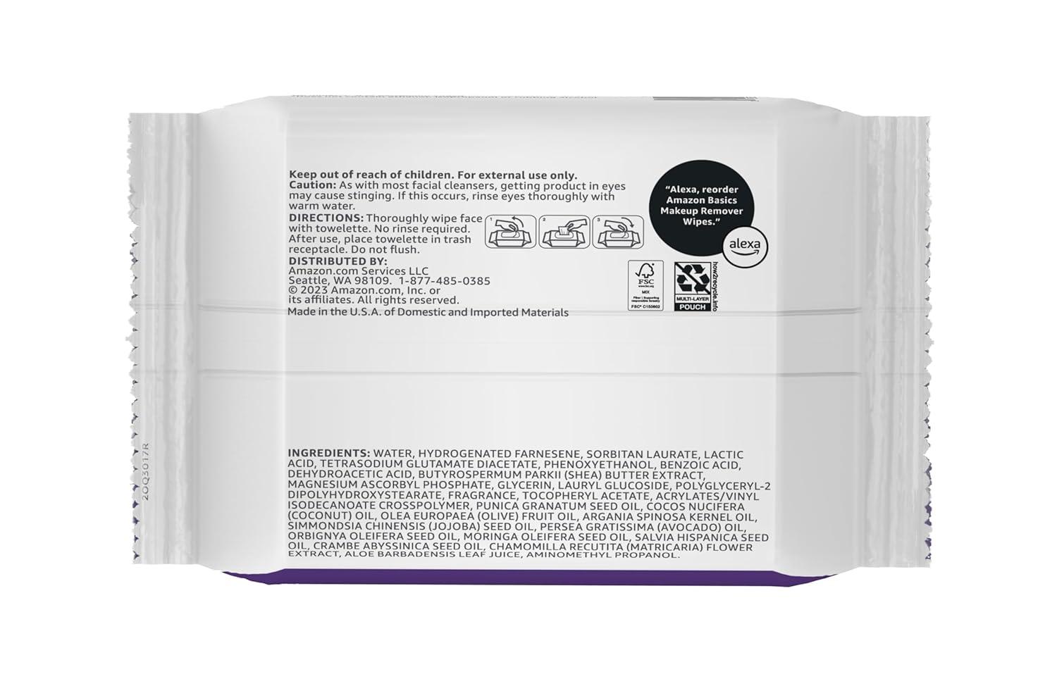 Alexa voice shopping enabled: to place your next order, just say, “Alexa, reorder Amazon Basics Makeup Remover Wipes”