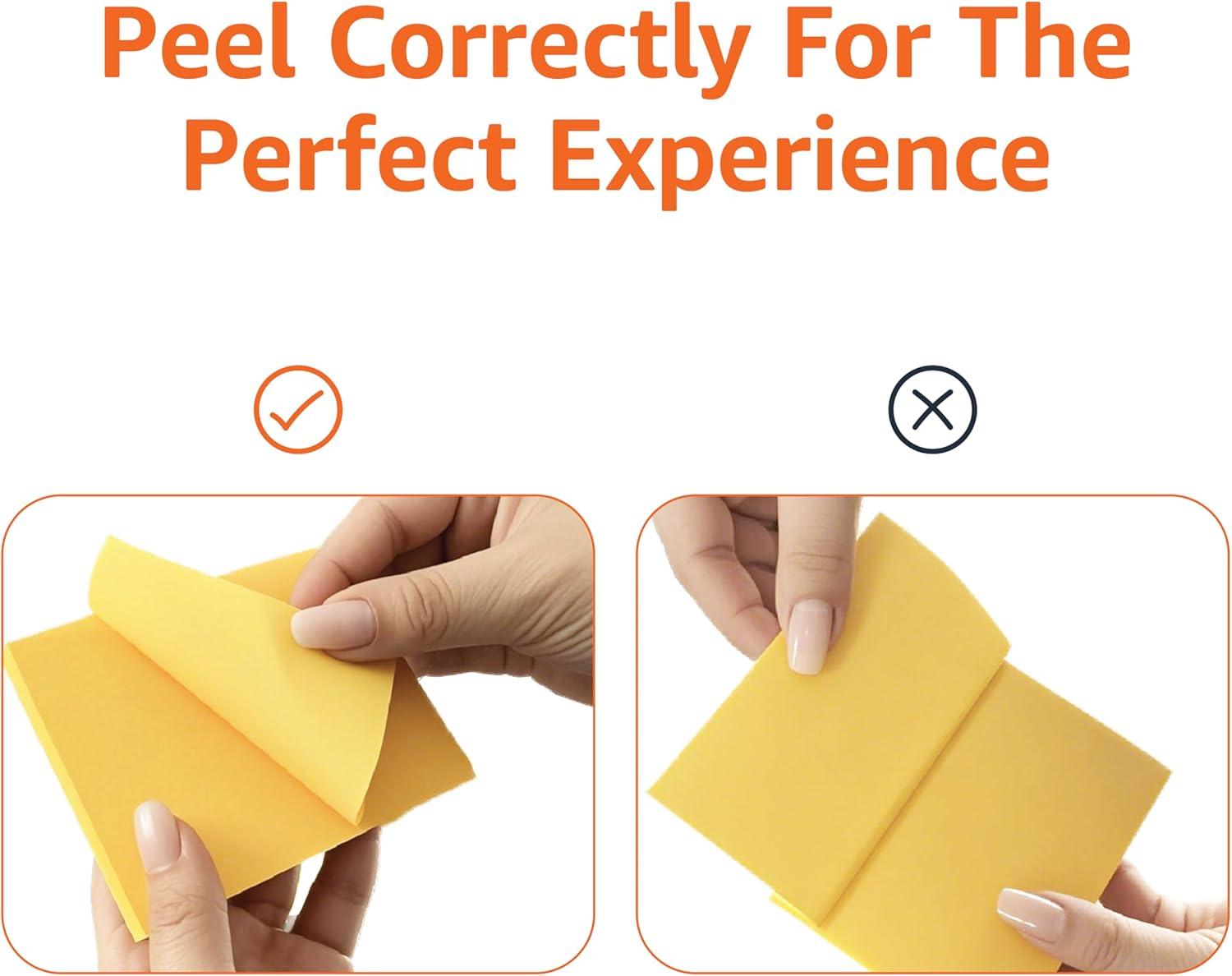 Note: For best results, remove paper from pad by slightly lifting from middle of bottom edge and pulling towards you, away from sticky edge in a straight motion (versus from bottom corner, pulling up diagonally and causing it to bend and curl); this helps ensure secure sticky placement