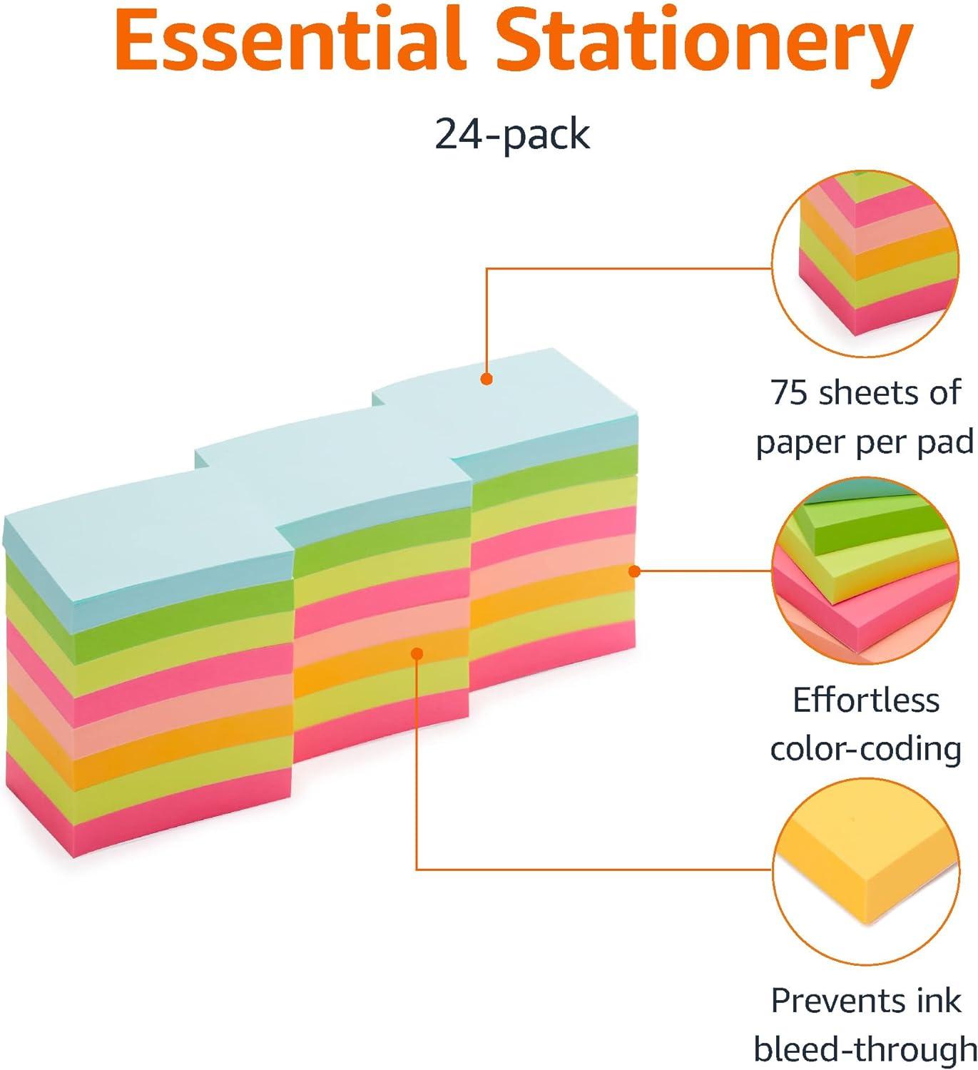 Amazon Basics Mini Rectangular Sticky Notes, 1.5×2 Inches, Bright Colors Self-Stick Pads, Easy to Post for Home, Office, Notebook, 70 sheets/Pad, Pack of 24