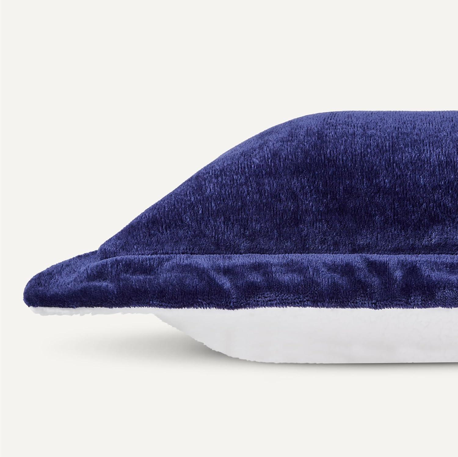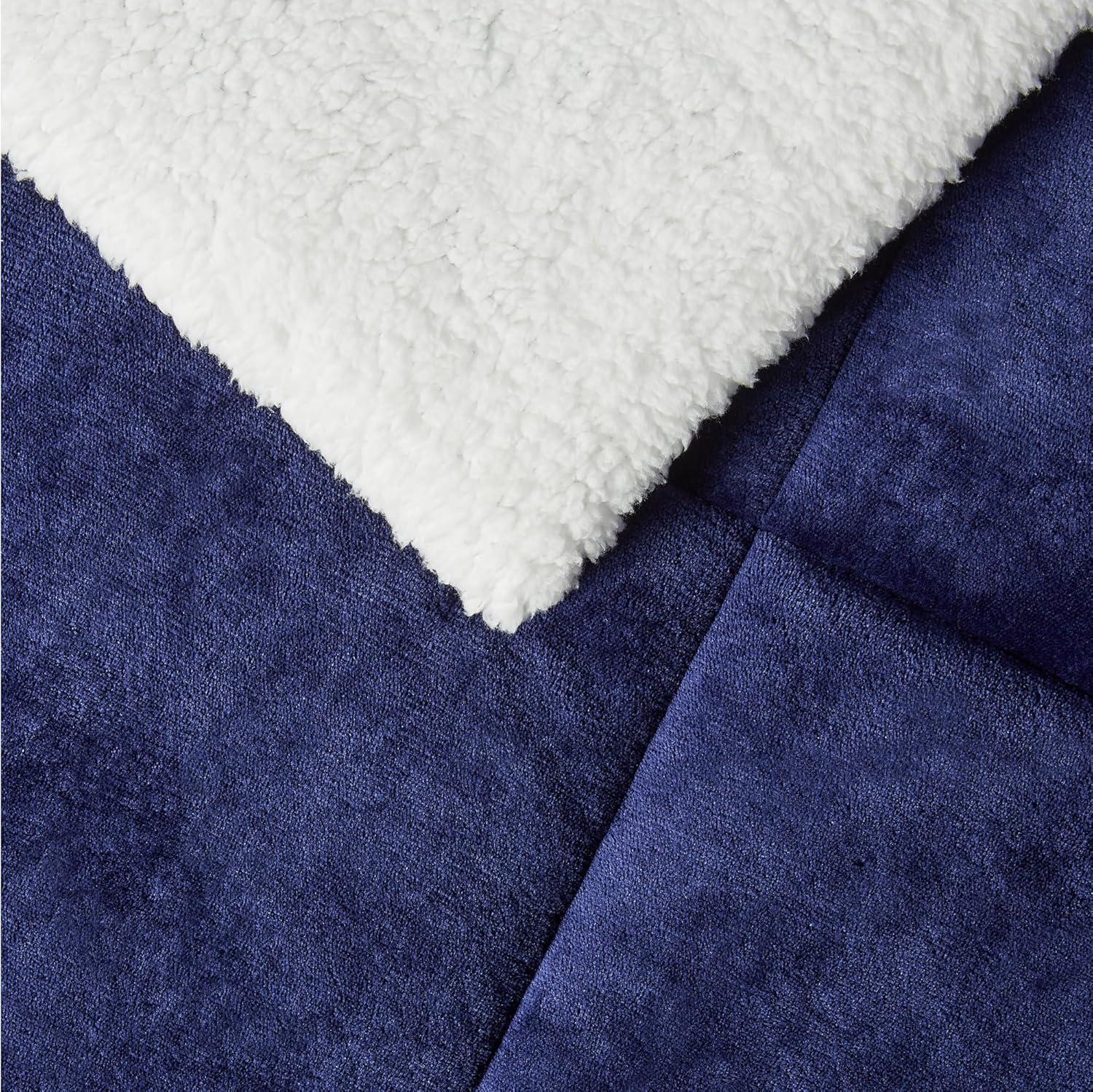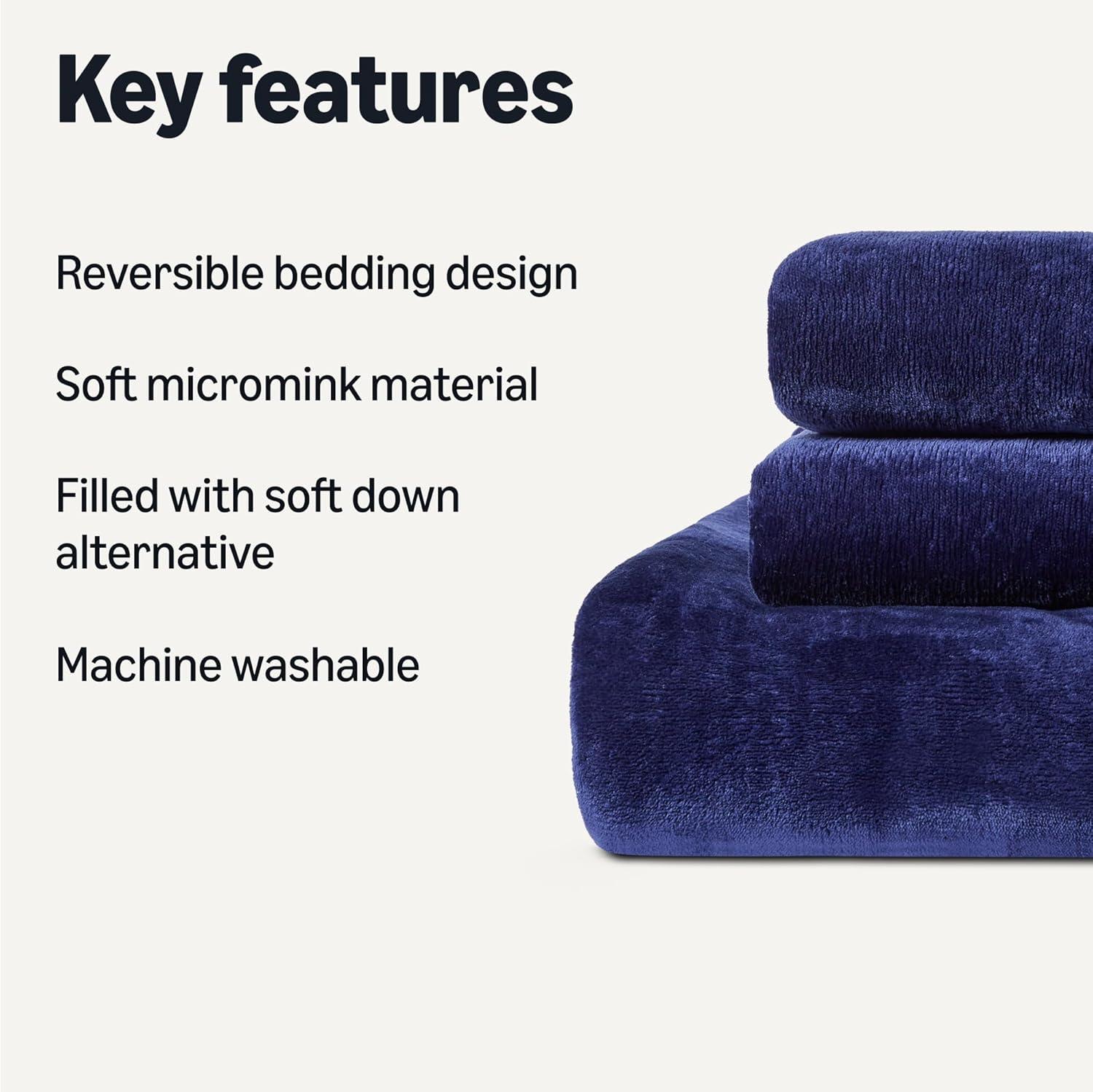 Reversible with soft micromink polyester in Navy on one side and white faux sherpa fleece on the reverse