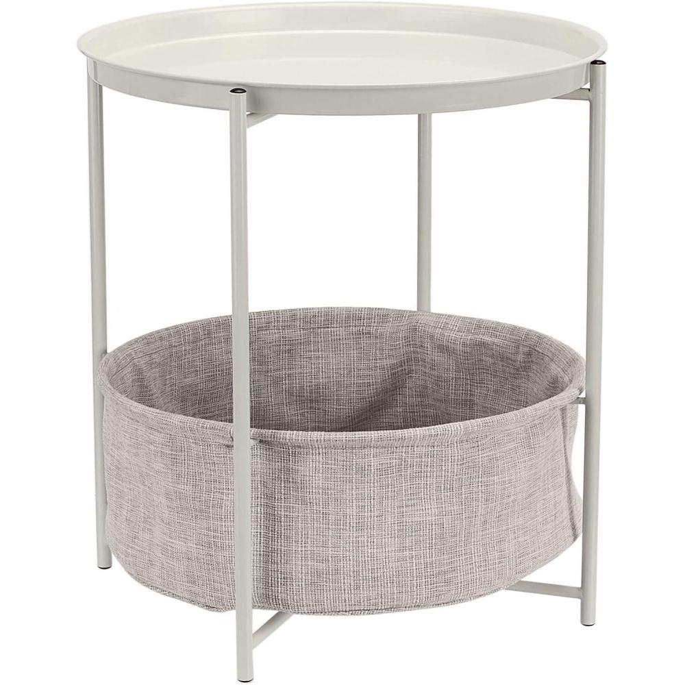 Circular metal accent table with tray top and secondary fabric storage bin underneath