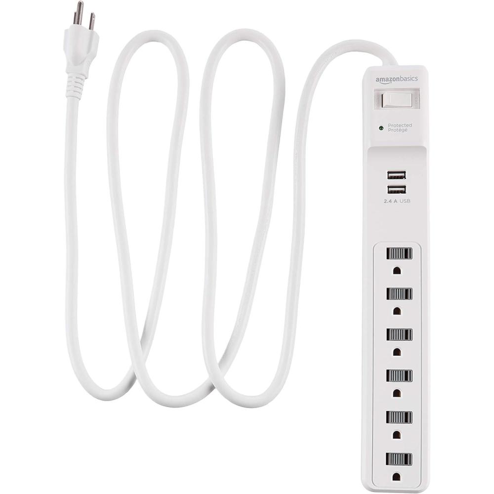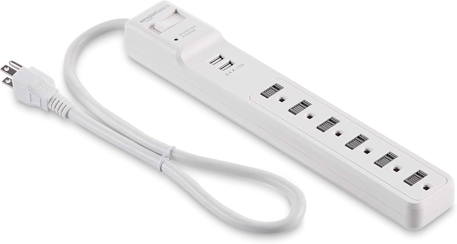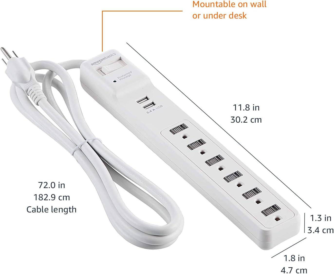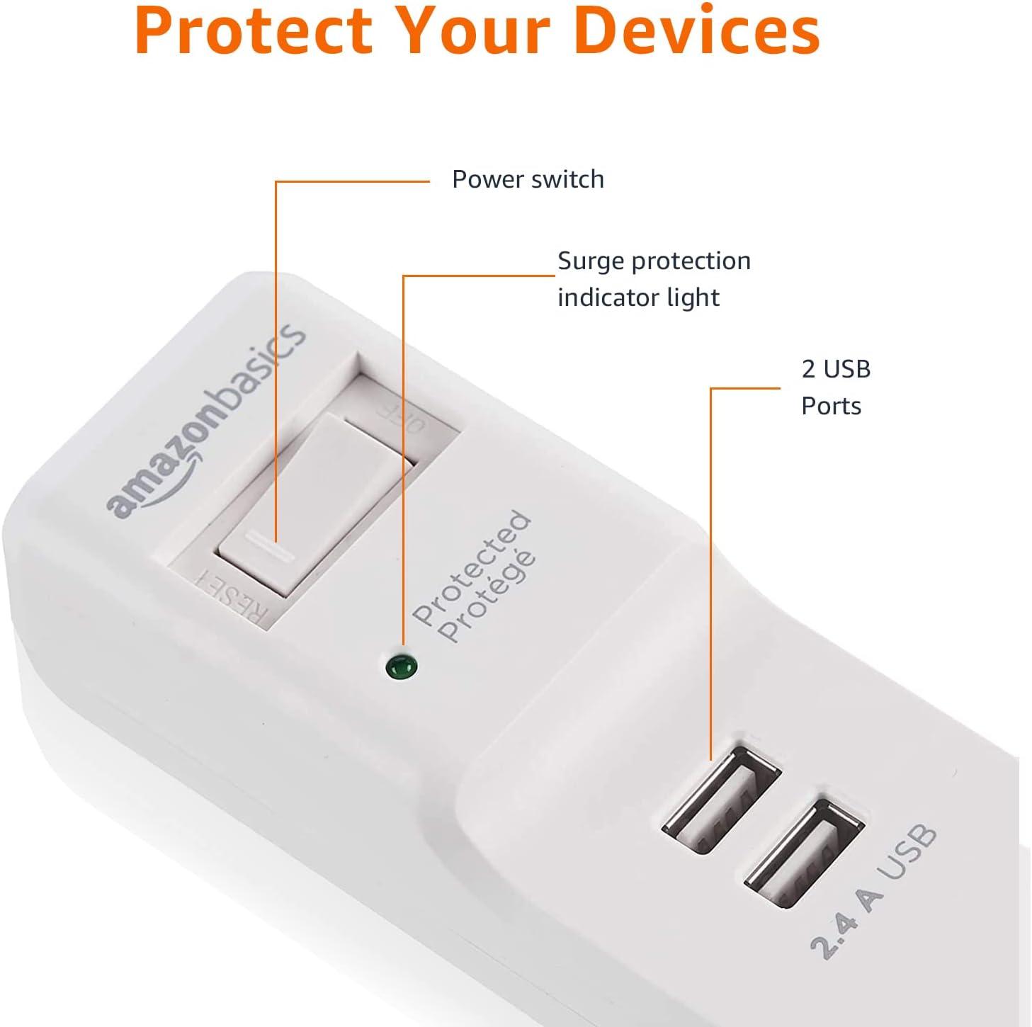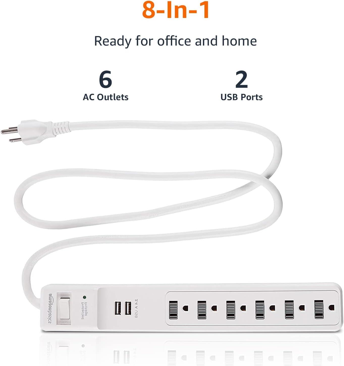 Amazon Basics Surge Protector Power Strip with 2 USB Ports, 6 Outlet Extension Cord, 1000 Joule, Rectangle, 6 ft Cord Length, Black(White)